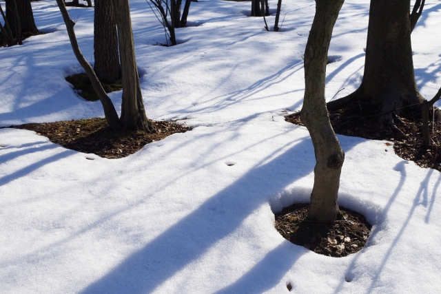 岩手など積雪の多い地域では毎年春が近づくと、枝先にまだ雪が残っているうちから、木の根元あたりの雪がいち早く解けてきます。